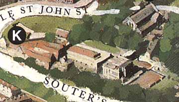 Here's a curiousity. While perusing a recently-acquired copy of Chester, a guidebook published by Pevensey Heritage Guides (a branch of Reader's Digest), we were attracted by a large, painted 'aerial view' of our fine city- a detail of which is reproduced here- but were surprised by the appearance of a large building shown standing between the amphitheatre (marked K) and the Bishop's Palace. Correct us if we're wrong, but isn't it the spitting image of the courthouse, (which was opened in June 2001)? Compare it with the above aerial photograph- it is certainly of similar scale and on the same alignment, parallel with Souter's Lane.