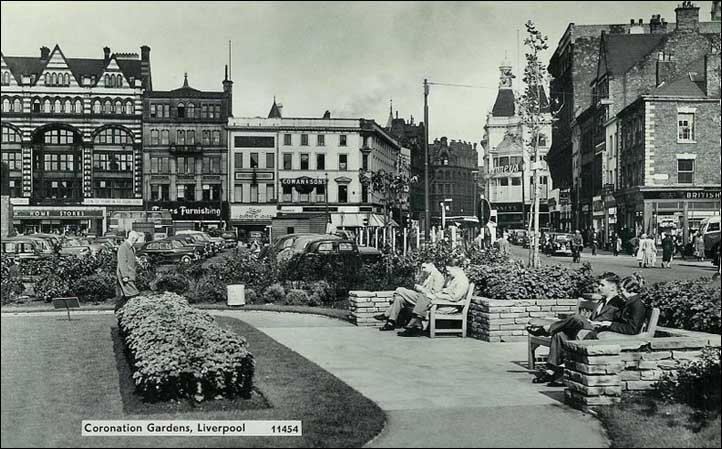 The Coronation Gardens in 1953. A source of some puzzlement to later generations, these temporary gardens were laid out to disguise the huge areas destroyed by German bombing in WW2. Paradise Street is on the right, leading to its junction with Whitechapel (notice Bunney's Stores on its corner), Church Street and Lord Street, seen in the background. The gardens sadly vanished when the entire area was rebuilt- and then rebuilt again with the recent coming of the vast Liverpool One development.. |
