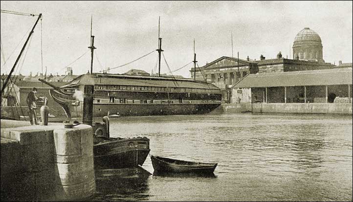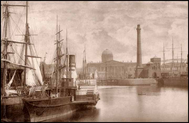 | The Customs House from George's Dock. The curious old ship in the background was the frigate HMS Tees, a gift from the government to the Mariners Church Society, which had been towed to the Mersey from Plymouth and converted into a floating church, which opened for worship in May 1827. It remained there, maintained by the Church of England, until 1872 when weakened by extensive dry rot, it sank at its moorings. |
