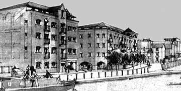 In the distance, just beyond the new bridge on the left is the Griffiths Brother's mill which was later restored and converted into what is now the Mill Hotel (see below). To its right, across the canal, the tall building is the Steam Mill, at this time the home of Miln's Seeds, which was also later superbly restored and today serves as a business centre, housing offices, studios and a bar / restaurant.
