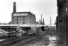 Nearer to us, the large building on the left was built in 1931 as a cinema- the Gaumont Palace- but today serves as a popular bingo club. The road along the left-hand side of the canal is Union Terrace, which led to the businesslike-sounding Cement Place and Leadworks Lane. This photograph of Canalside- the road along the right-hand side of the canal as we view it- was taken around the same time as the one above, showing the Ring Road bridge during the course of construction.The industrial buildings around Queen Street on the right have since been replaced with new houses. The bulk of the Griffiths Brothers Mill, "Provender Millers and Merchants", later the Mill Hotel, dominates the background.