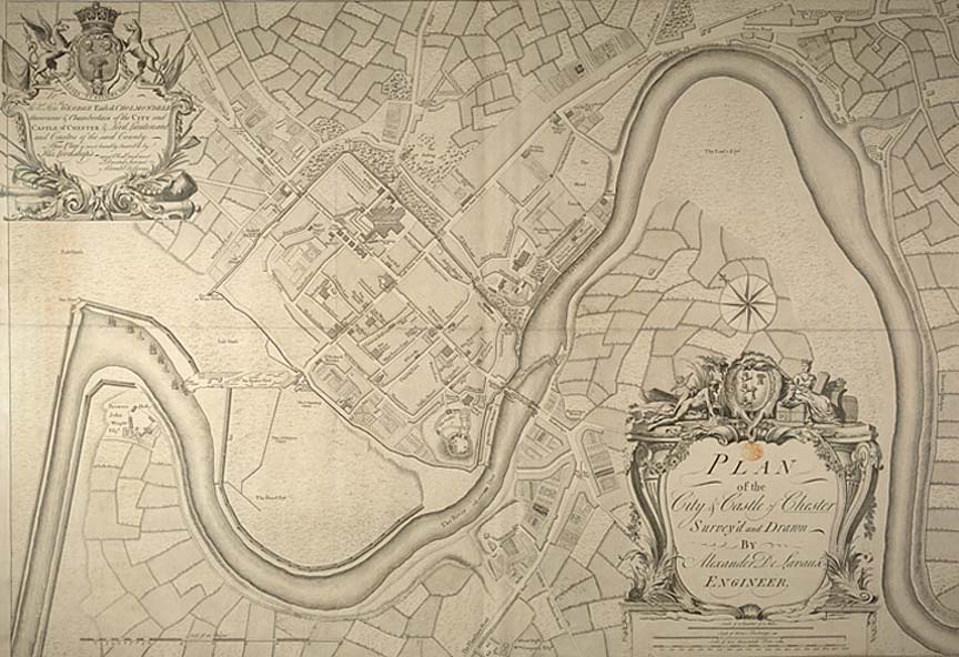 | This plan was surveyed and drawn by the engineer and surveyor Alexander de Lavaux. It reveals numerous interesting details of the mid-18th century city, including the names of prominent property owners, the arrangement of the surrounding fields and fascinating details such as the existence of a maypole in Northgate Street. Looking at the map, it sems that those fields are very much the dominant element of the scene and the small city remains largely confined behind its ancient circuit of defensive walls. On the far left we see the River Dee following its strange new, man-made course which had come about a mere thirteen years befor this map was made. The interest of this map is in the detail so here are a series of enlarged sections and descriptions: |