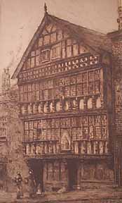 The ancient Bear & Billet may be thriving but many others have not been so fortunate- go here to learn about the many Chester pubs that have ceased to be. On the corner of Shipgate Street, and prominent in Louise's painting, is one such ancient tavern, the Old Edgar, dating from around 1500, which, after years of dereliction was restored and now serves as two private residences. It is named after King Edgar of England, who, according to legend, was rowed on the River Dee from his palace in what is now known as Edgar's Field, just across the bridge, to St. John's Church by eight subject kings in token of submission to him. The event was portrayed on a large painting which can be seen on the inn's wall. A splendid copy of this, translated onto ceramic wall tiles, is a proud feature in the George Street entrance to the Bull & Stirrup Hotel in Northgate Street.