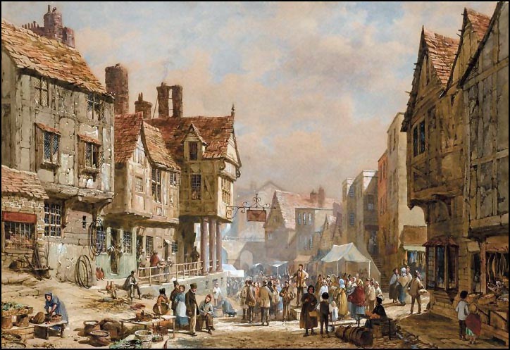 | Compare the above with the wonderful rendering below, created by Martin Moss, which shows Lower Bridge Street as it would have looked in the 19th century. |