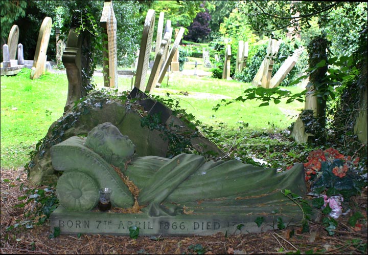 Here is the realistically-carved memorial stone of three-year-old Mabel Francis Ireland-Blackburn, who reputedly choked on chewing gum (but actually died of whooping cough) in 1869. She became known locally as the 'Chewing Gum Girl' because of a notice said to have been posted up near her grave to discourage the young from using gum: