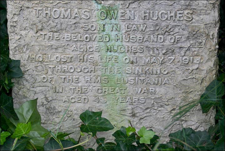 Another Thomas Hughes! This memorial is to Thomas Owen Hughes who was a storeman who went down on the RMS Lusitania. The sinking of the Lusitania was a major event of World War One. Many believe it was the first in a series of events that would lead to the American`s joining the war. Lusitania is regarded as the second most famous ship to be lost at sea, after the Titanic. Much has been written about her sinking on 7th May 1915 off the coast of Ireland, when the German submarine U-20 fired a torpedo into her Hull. Lusitania sank within 18 minutes, the loss of life was on a terrible scale. 1,198 people died (785 passengers and 413 crew). www.liverpoolmuseums.org.uk/maritime/collections/liners/lusitania/ There is a memorial to some of those lost at Our Lady's Church, Eldon Street, Liverpool (there's also some interesting newspaper cuttings here)- |