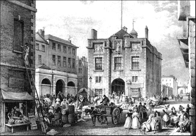 John Tilston, incidentally, was also the sculptor of the ornate (and today, sadly eroded) plaque mounted on Pemberton's Parlour, which bears the Royal and City Arms and records the remarkable (and probably unique) conversion of the war-battered City Walls into the pleasant elevated promenade which millions of visitors have enjoyed ever since. In 1852, just eight years before its destruction, the Exchange underwent a radical restoration, Thomas Hughes of Aldford being the contractor and Benjamin Baylis the architect. Queen Anne was included in the work, "the statue of Queen Anne is to be restored, painted and regilt, and securely fixed to the building by a copper bar one inch square, with nuts and screws; also the pedestal the statue rests upon, and the moulding around the niche". The anonymous author of the early 19th century work, A Walk Round the Walls and City of Chester, wtote that "The Exchange is a large handsome pile, supported by five columns in the centre, and has a row of shops on the west side. It was built around the year 1698, in the mayoralty of Colonel Robert Whitley, who gave his toll toward defraying the expences of the building. The length is 126 feet, and the breadth 46 feet. The courts of Justices are held in a large commodious common hall over the exchange. In this place the Mayor, assisted by the Recorder, holds the courts of crownmote, portmote and sessions. Here the body corporate hold their assemblies for making bye-laws and other public business. The elections for Mayor, and other annual Officers, as likewise for Members of parliament, are held here; also the mansion house, where the Mayors have their entertainments, and the citizens their assemblies during the winter. Fifteen